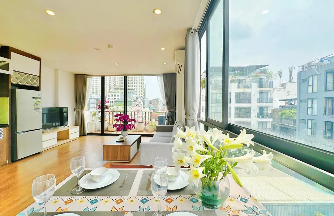 Staying at Hanoi Home 4 - Cheap Price 2 Bedroom Apartment Near West Lake, guests have access to a balcony, a terrace, and a seating area equipped with air conditioning. Visitors will enjoy the comfort of a bathroom with a dryer, towels, and bathrobes in this apartment. You'll also come across a separate toilet, a shower, and a washing machine.